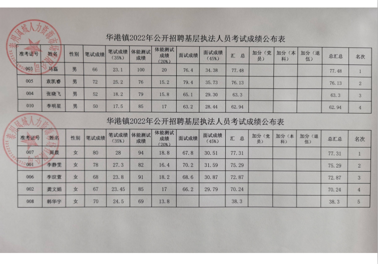 華港鎮(zhèn)2022年公開(kāi)招聘基層執(zhí)法人員考試成績(jī)表
