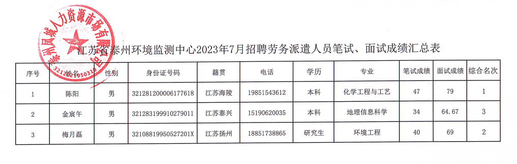 泰州市環(huán)境監(jiān)測中心招聘成績公示