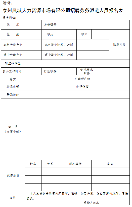 泰州鳳城人力資源市場(chǎng)有限公司招聘勞務(wù)派遣人員報(bào)名表 點(diǎn)此下載