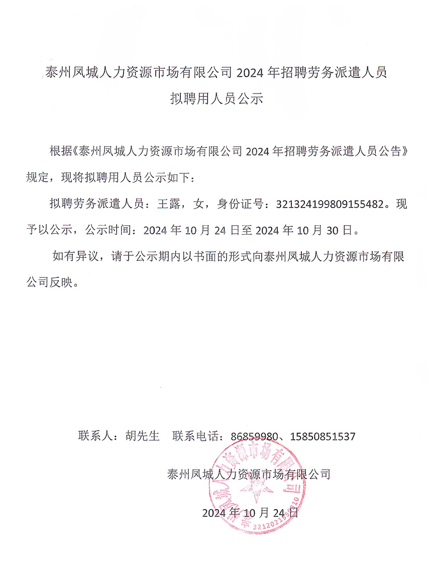 泰州鳳城人力資源市場有限公司2024年招聘勞務(wù)派遣人員擬聘用人員公示