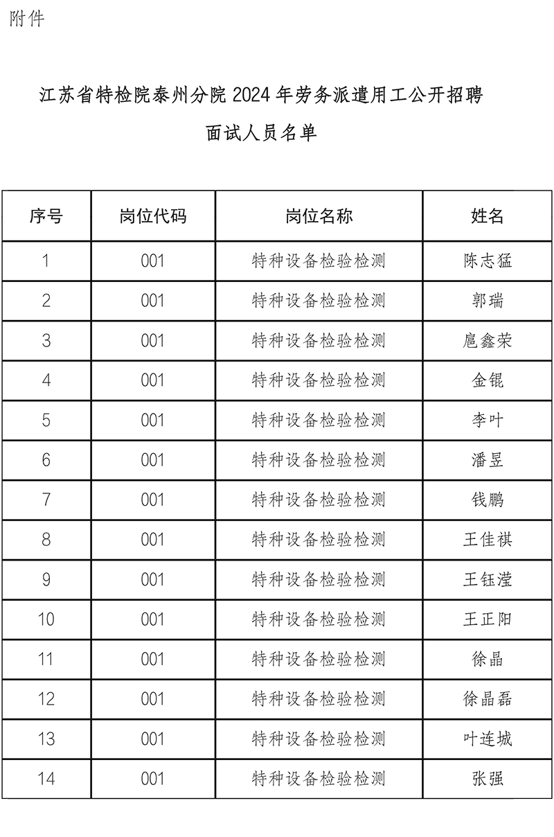 根據(jù)《江蘇省特種設(shè)備安全監(jiān)督檢驗研究院泰州分院2024年勞務(wù)派遣用工招聘公告》,經(jīng)資格審核,現(xiàn)將參加面試人員名單予以公示(名單附后)。面試時間、地點另行通知。